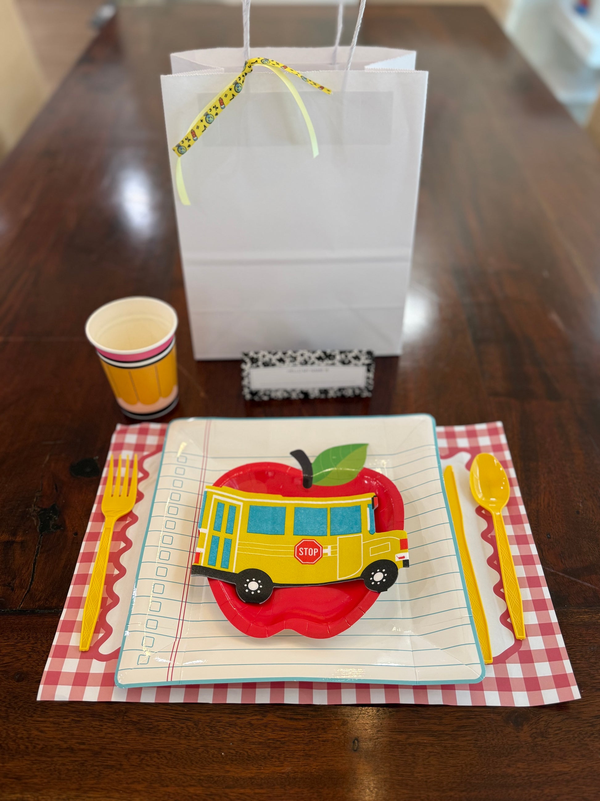 -bag (can be reused for back to school gift for your child or teacher), placemat, cup, utensils, two plates, name plate, and a napkin